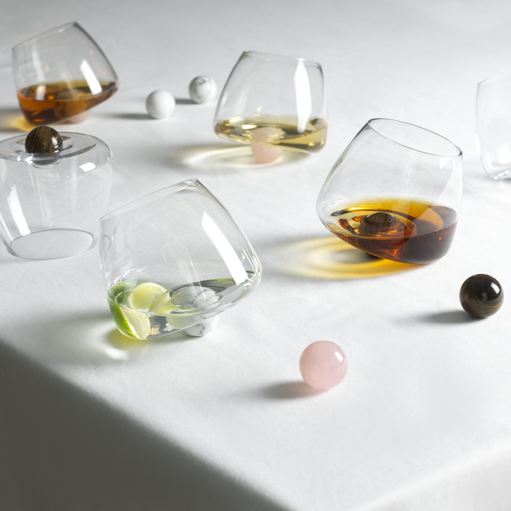 But wait, there’s more! Underneath this beautiful glass is a natural stone sphere that allows the tumbler to tilt and spin gracefully on any surface without ever spilling a drop. It’s like the glass is joining the party, adding a playful touch to every drink.