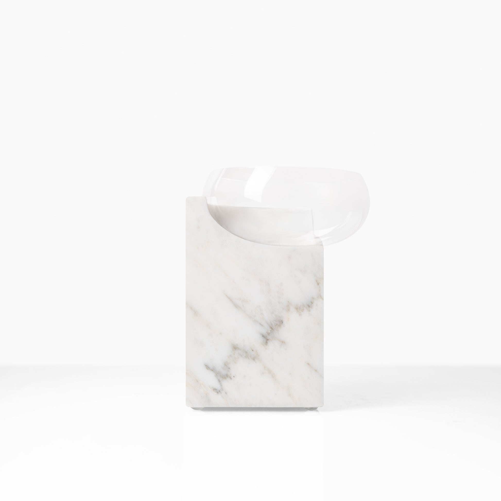 The Cliffhanger cocktail glass was designed to reimagine the classic cocktail glass, not just with its bold design, but by delivering an entirely new drinking experience. Composed of a mouth-blown crystal coupe and a sculpted marble base that serves as the "stem", it’s a striking two-part creation. Lifting only the crystal coupe to sip introduces a playful surprise, adding intrigue while elevating the elegance. The off-center placement engages your senses, inviting a more mindful, tactile ritual with every sip.