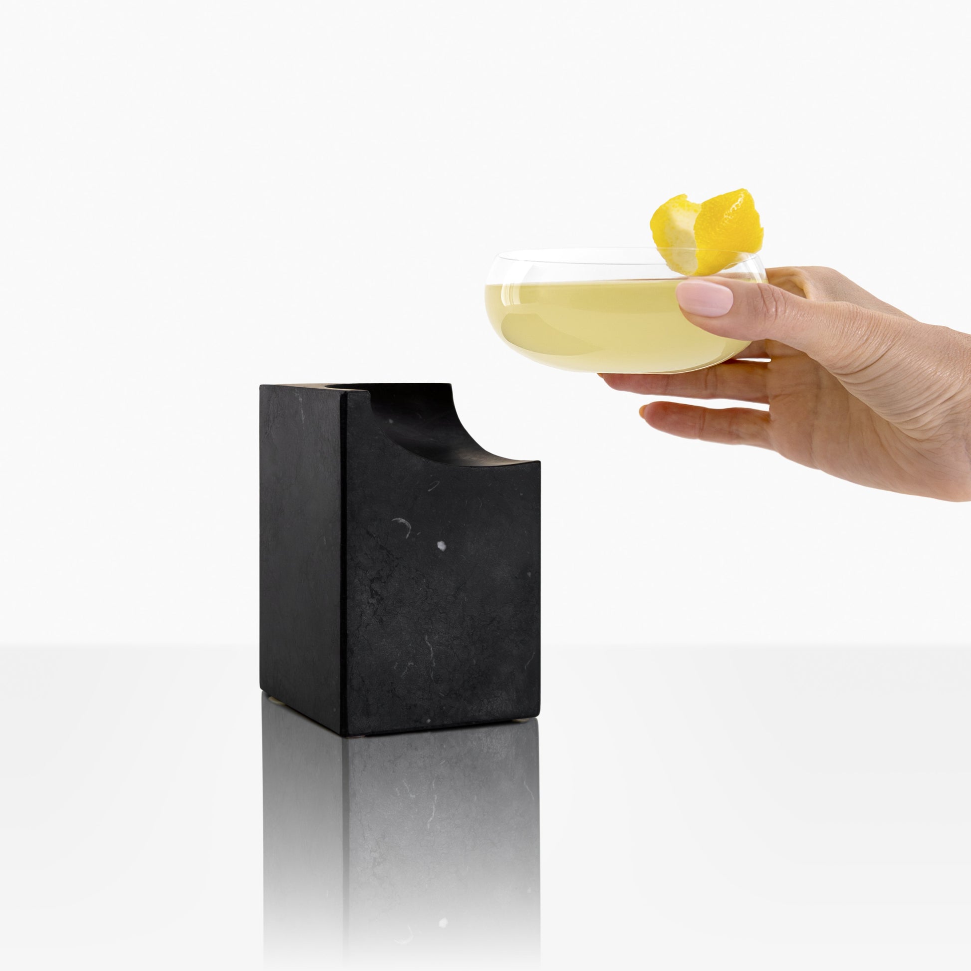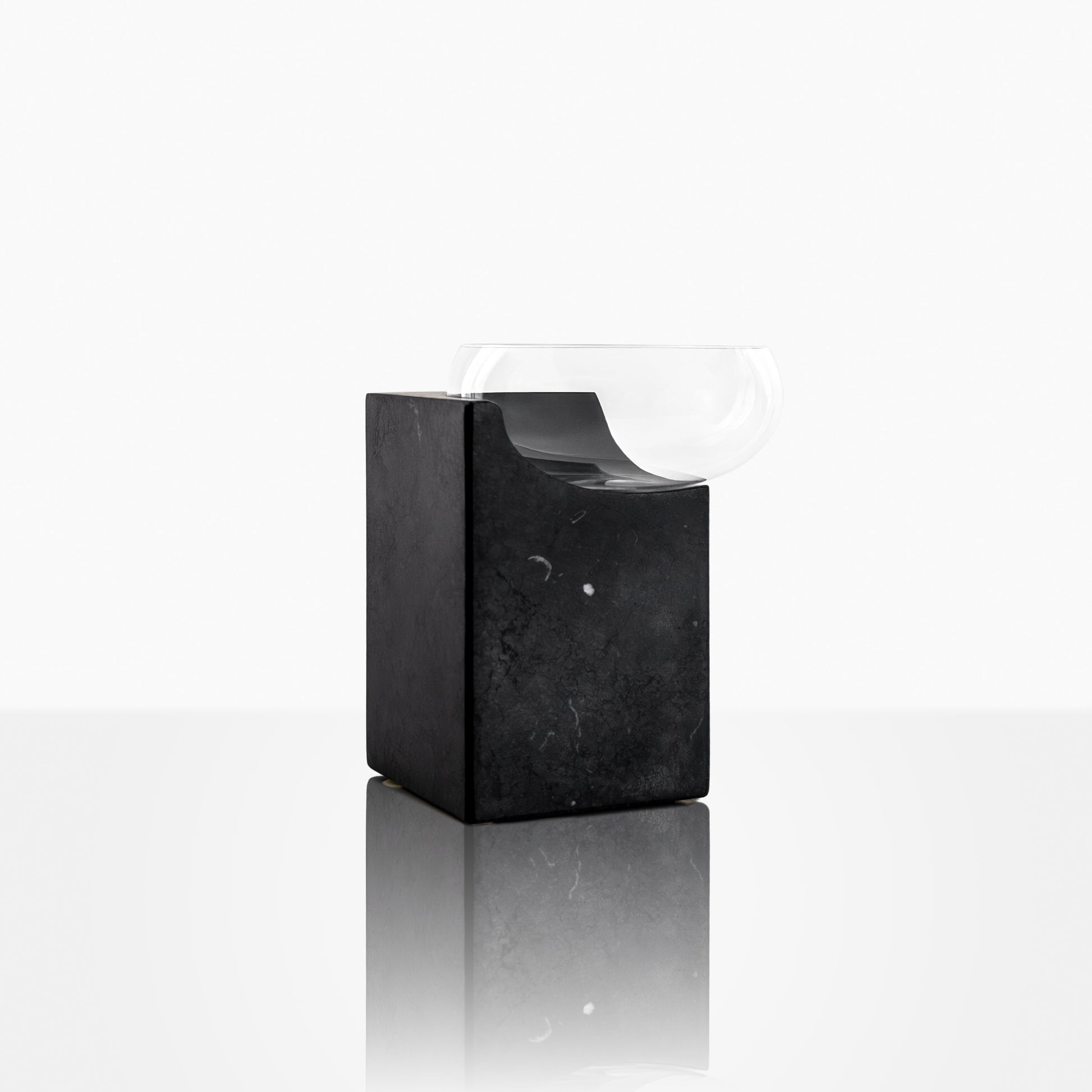 The Cliffhanger cocktail glass was designed to reimagine the classic cocktail glass, not just with its bold design, but by delivering an entirely new drinking experience. Composed of a mouth-blown crystal coupe and a sculpted marble base that serves as the "stem", it’s a striking two-part creation. Lifting only the crystal coupe to sip introduces a playful surprise, adding intrigue while elevating the elegance. The off-center placement engages your senses, inviting a more mindful, tactile ritual with every sip.