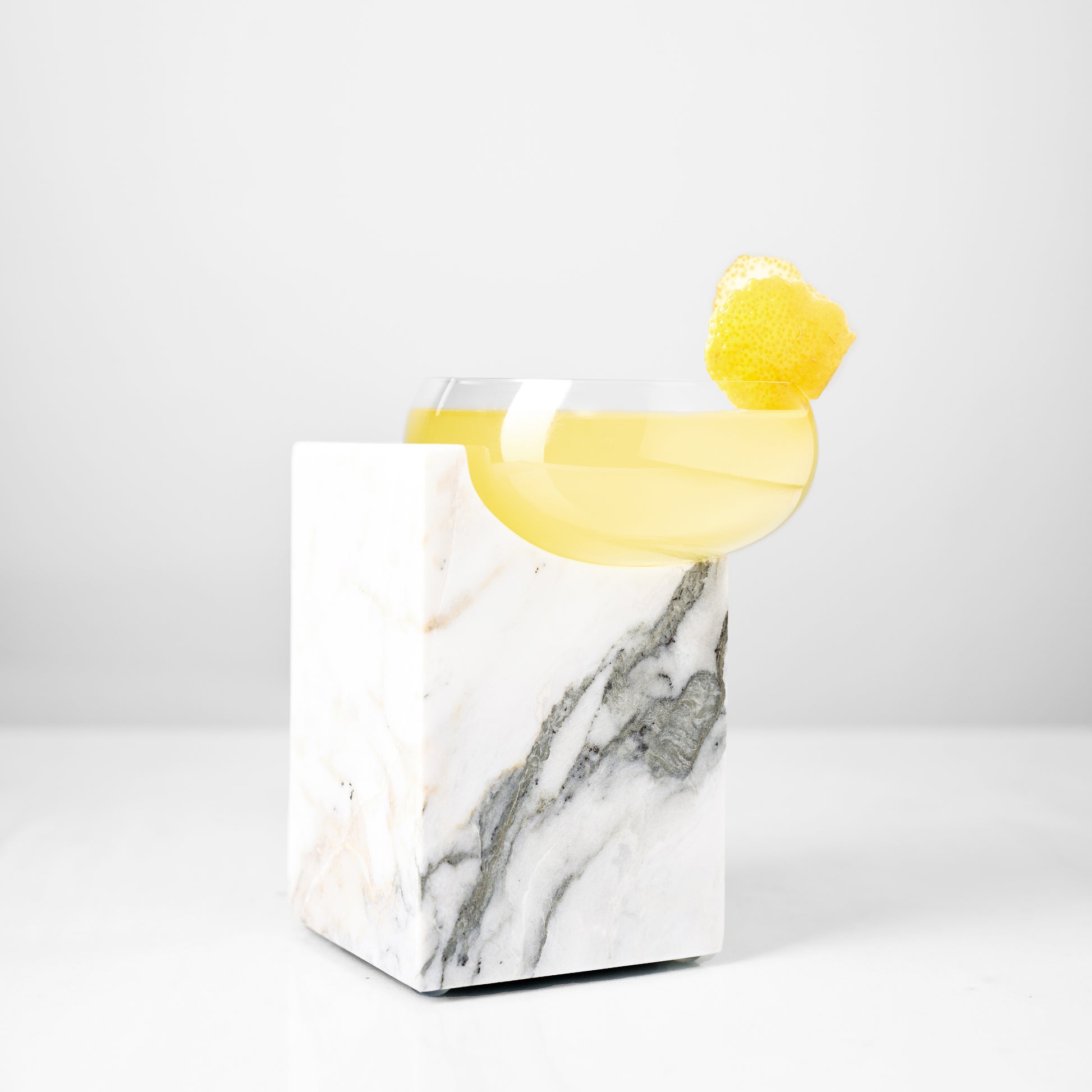 The Cliffhanger cocktail glass was designed to reimagine the classic cocktail glass, not just with its bold design, but by delivering an entirely new drinking experience. Composed of a mouth-blown crystal coupe and a sculpted marble base that serves as the "stem", it’s a striking two-part creation. Lifting only the crystal coupe to sip introduces a playful surprise, adding intrigue while elevating the elegance. The off-center placement engages your senses, inviting a more mindful, tactile ritual with every sip.